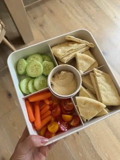 This is a hit for kids and adults alike. Soft pita, fresh veggies and yummy hummus for dipping. Great for picnics and pool days alike.