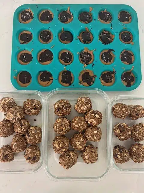 Note: the peanut butter chocolate cups are best left at home in the freezer, but the protein bites are perfect for on the go!