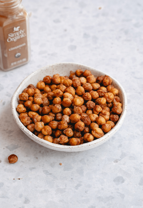 - Once dried, transfer chickpeas to a bowl and toss with the olive oil, maple syrup, cinnamon and salt.