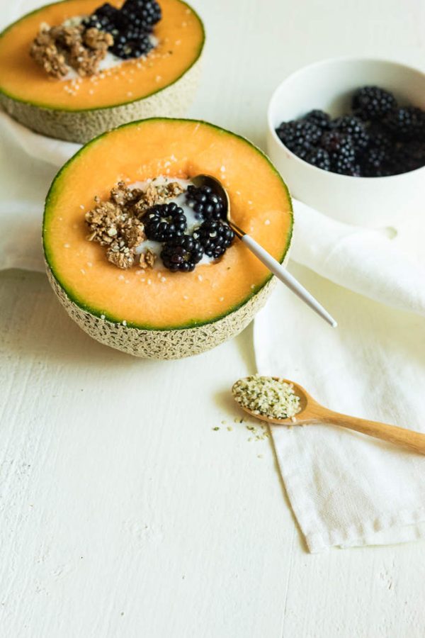 - Slice the cantaloupe in half and remove the seeds.