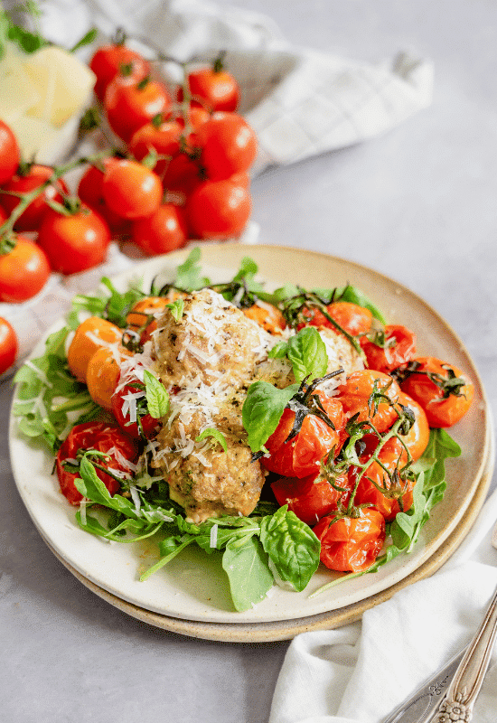 - To serve, top arugula with 3 meatballs per person, and divide the tomatoes evenly, topping with parmesan cheese.