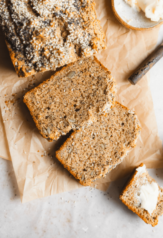 - In a large bowl, whisk together the all purpose flour, whole wheat flour, sunflower seeds, pumpkin seeds, poppyseeds, sesame seeds, baking powder, and salt.