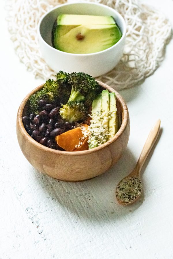 - Add the cooked salmon or turkey to the bottom of a bowl and top with the cooked and cubed sweet potato, broccoli, black beans, and avocado.