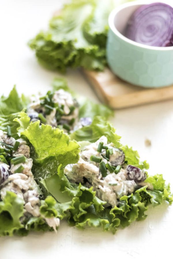 - To prepare the salad, add the cooked chicken to a mixing bowl followed by the dressing. Mix in all the remaining ingredients and serve over lettuce leaves.