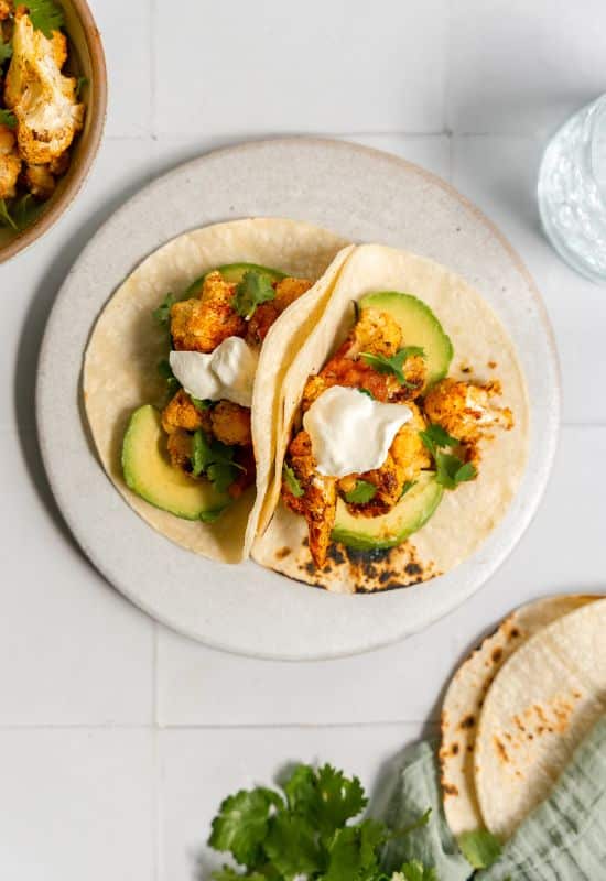 - Assemble the tacos with salsa, and sliced avocado. Top with the greek yogurt, lime juice, and cilantro. Enjoy!