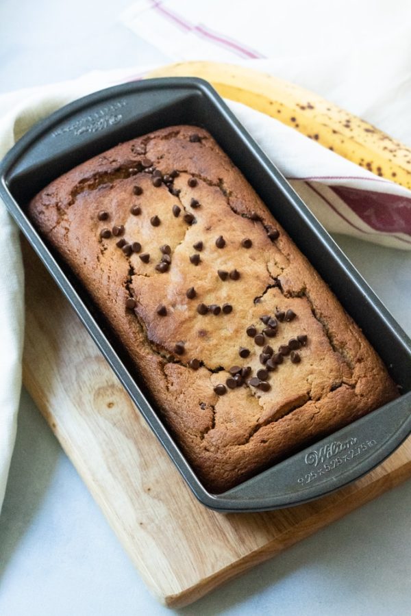 Wonderful banana bread. I omitted sugar and it was plenty sweet from ripe bananas and semi sweet chocolate chips. Thank you!