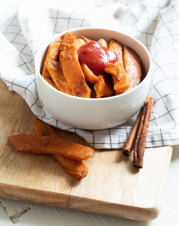 - Wash the sweet potatoes, peel, and cut into french fry strips.