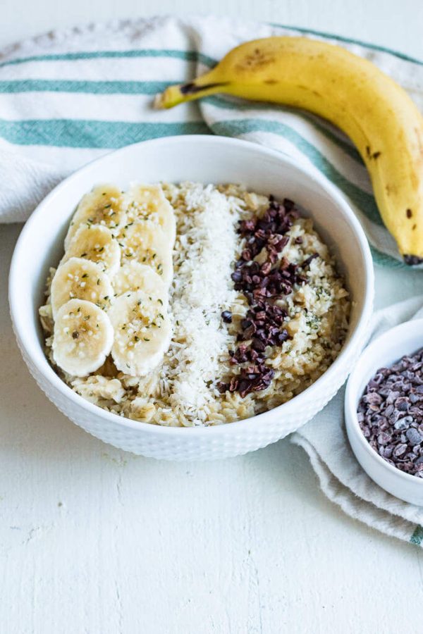 - Pour into your favorite serving bowl and top with the sliced banana, cacao nibs, shredded coconut, and hemp seeds.