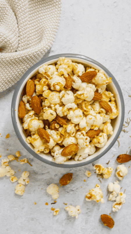 - Combine popped popcorn and almonds in a large bowl.