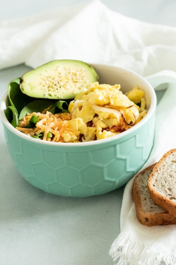 - Assemble the bowl with the spinach as your base and top with the onions, scrambled eggs, sliced avocado, and shredded cheese. Season with sea salt and pepper.