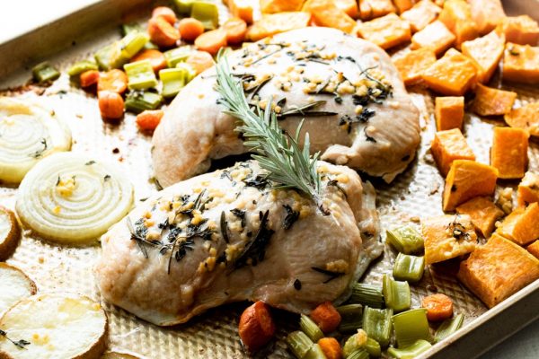 - Remove from the oven and add the sliced russet potatoes, sweet potato cubes, onion, celery, and carrots to the sides of the pan, surrounding the turkey, and drizzle with the remaining olive oil and herb marinade. Return to the oven and bake for another 30-40 minutes or until the turkey is completely cooked through.