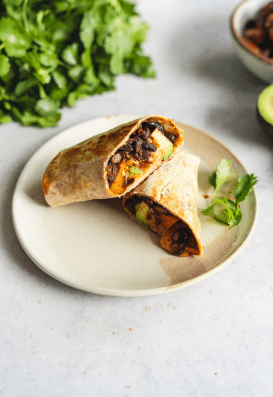 - Once cooked, divide the mixture between the four tortillas. Top with avocado, salsa, and cheese. Fold in the sides, and tightly roll. If desired, cook for 2 to 3 minutes in a hot frying pan.