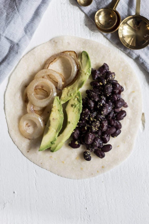 - While the onions are cooking, add the black beans and sliced avocado to the gluten-free tortilla.