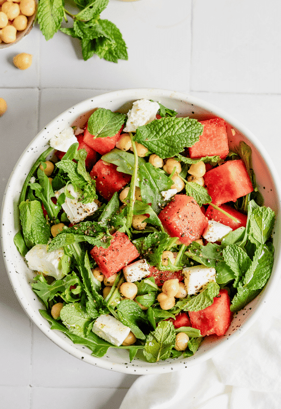- Combine the watermelon, chickpeas, arugula, mint, and feta in a bowl.